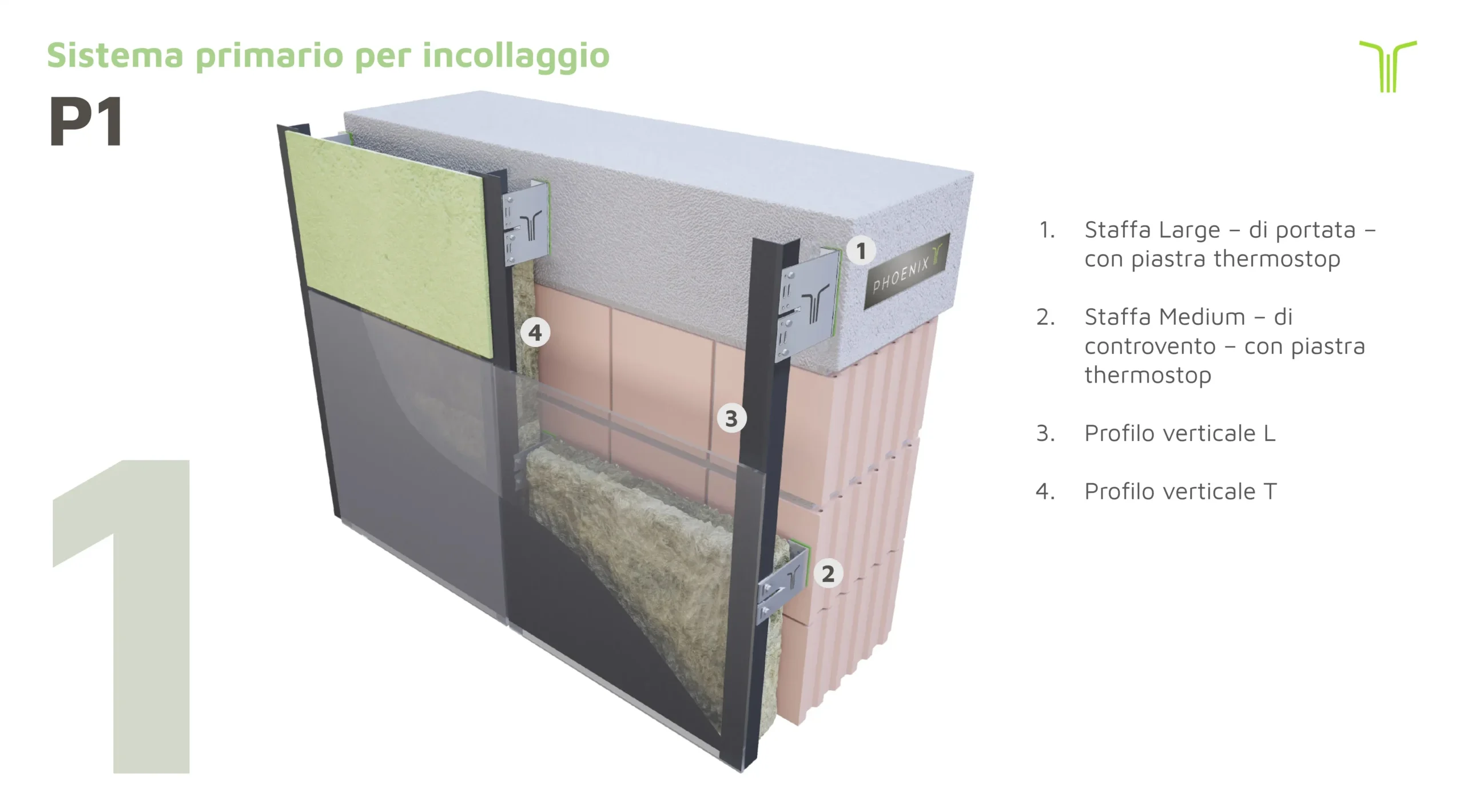 Il sistema P1N / P1B è una sottostruttura verticale per facciate ventilate con aggancio a scomparsa, progettata da Phoenix per garantire rigidità , precisione di posa e continuità estetica.