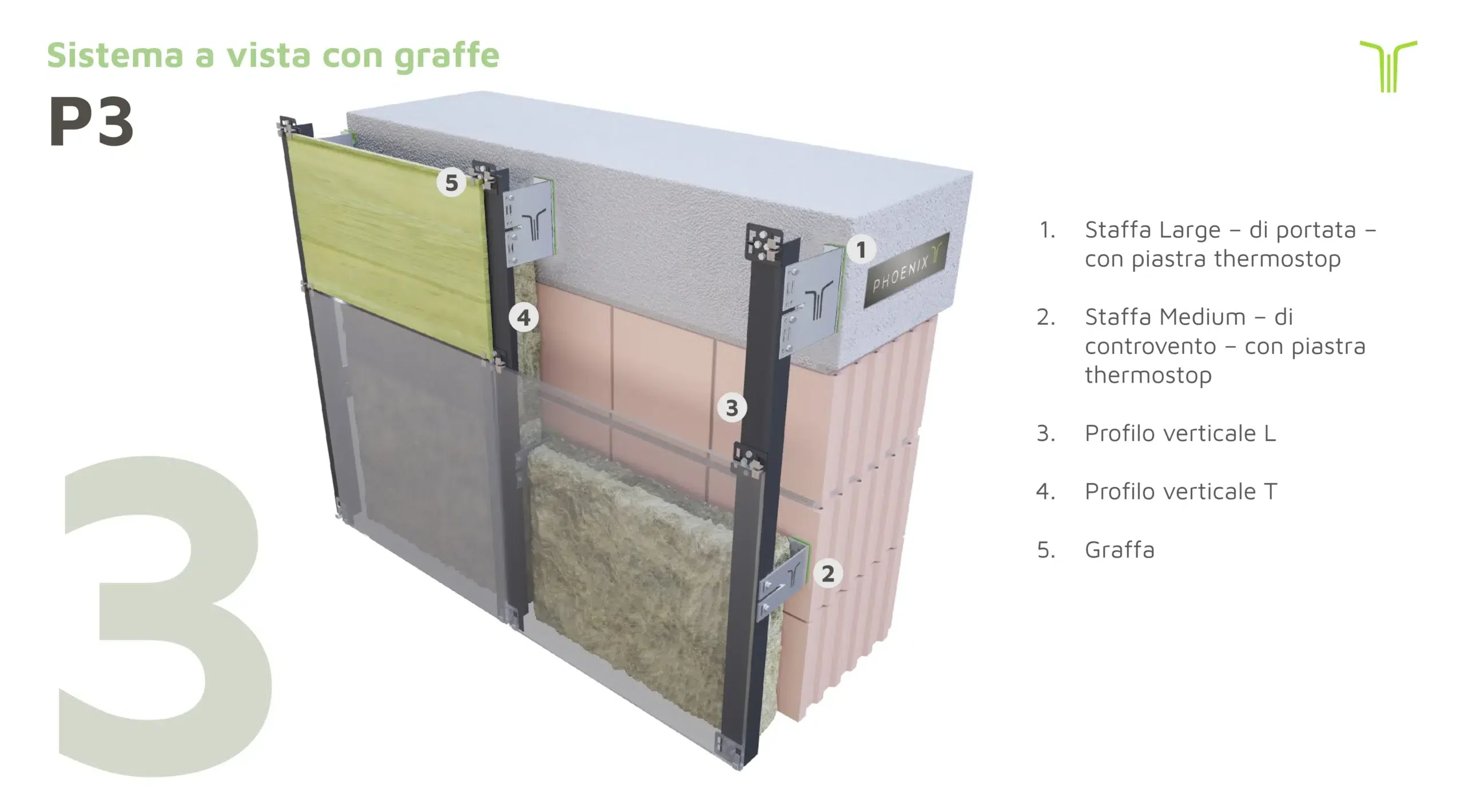 Il sistema P3N / P3B è una sottostruttura verticale con aggancio a vista tramite clips, studiata da Phoenix per unire efficienza di montaggio, precisione e resa estetica controllata.
